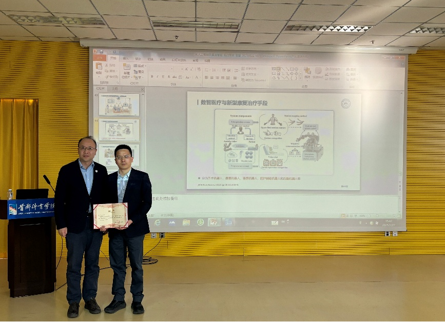李子孝教授结合临床实际,对人工智能在脑血管病领域的现有研究、脑血管医疗质量改进技术、医疗智能机器人在脑血管病管理中的应用以及数智医疗与新型康复治疗手段等进行了详细介绍,并对人工智能技术的应用前景进行了展望,同时也表示体育运动知识在临床应用中具有重要作用,希望今后能与体育领域专家学者加强交流合作。讲座内容结束后,现场师生与李子孝教授进行了深入交流与讨论,左伟副院长代表学校向李子孝教授的精彩讲授和对学校发展的支持表示感谢,并颁发了讲座证书。