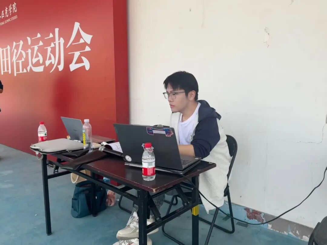 运动场外,亦有志愿者们在后场默默奉献的身影,一名志愿者负责运动会的播报工作,提醒各位运动员做好检录工作,播报比赛秩序以及为运动员们加油打气,展现出良好的服务意识。