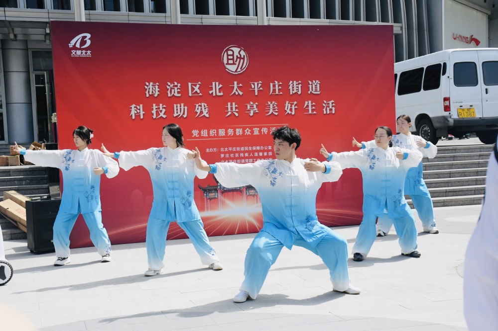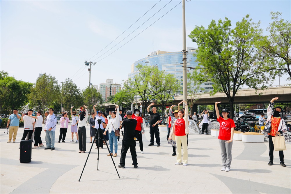 在活动现场之一的枫蓝国际广场,志愿者们有的在咨询台前解答周边居民有关健康问题的疑问;有的带着老年人和残疾人朋友玩“沙包掷准”“蒙眼塞笔”的小游戏,一边示范一边向他们讲解这些动作所锻炼的肌肉群;另一边,几名同学现场示范八段锦,围观居民很快跟着练起来;还有的同学铺开瑜伽垫,演示起一些基本的拉伸动作。