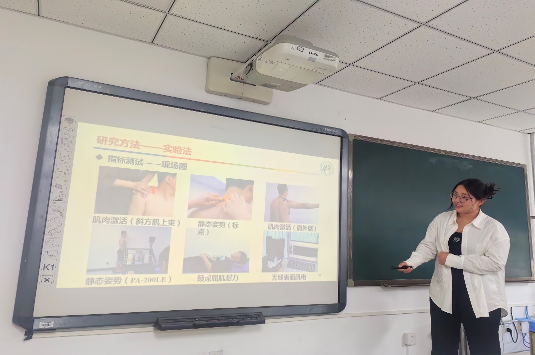 亓雨晴以“一次性高强度间歇运动对不同鼠龄大鼠骨骼肌端粒酶的影响机制研究”为题,介绍了通过观察运动后大鼠体内氧化抗氧化水平与端粒酶表达变化来探究氧化应激视角下的运动调控端粒长度具体作用机制的研究及其成果。张梁以“力量训练结合神经-肌肉关节促进法对久坐大学上交叉综合征的干预效果研究”为题,介绍了力量训练结合神经-肌肉关节促进法对久坐大学生上交叉综合征的干预研究及效果。随后,现场师生围绕研究内容和研究方法进行了交流讨论。