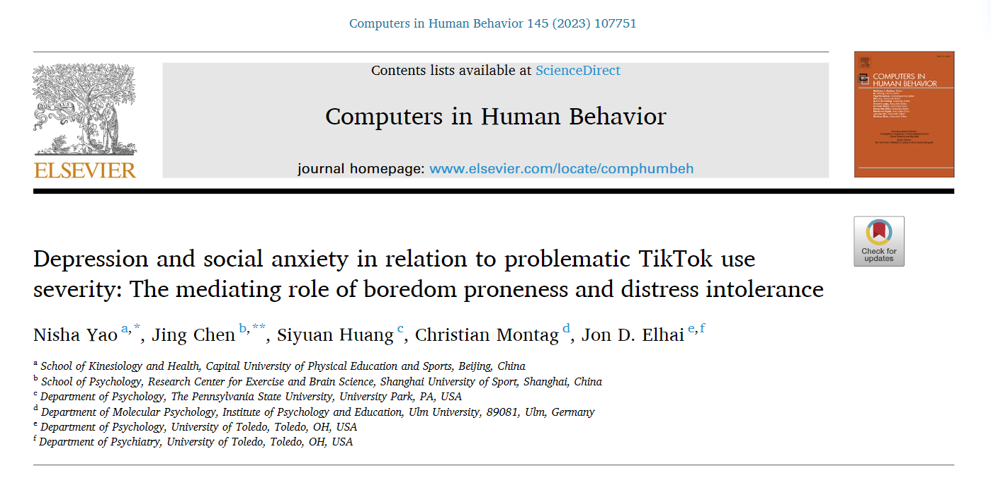 2023年8月,姚泥沙老师在Computers in Human Behavior发表学术论文Depression and social anxiety in relation to problematic TikTok use severity: The mediating role of boredom proneness and distress intolerance。《Computers in Human Behavior》为中科院心理学一区期刊,该期刊既探讨计算机在心理学、精神病学和相关学科中的应用,也探讨计算机的使用对个人、群体和社会的心理影响。