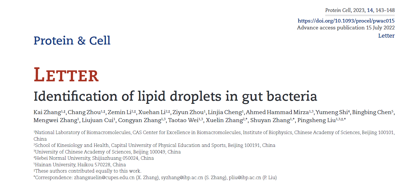2023年3月,张雪琳老师在Protein Cell发表学术论文Identification of lipid droplets in gut bacteria。《Protein Cell》为中科院生物学与细胞生物学一区期刊,主要报道生命科学和生物医学领域的最新研究成果和前沿热点,维度跨越分子、细胞、模式生物、生物技术、基础与临床医学,研究对象涵盖微生物、植物、动物、人体,是一本国际化的综合性学术期刊。