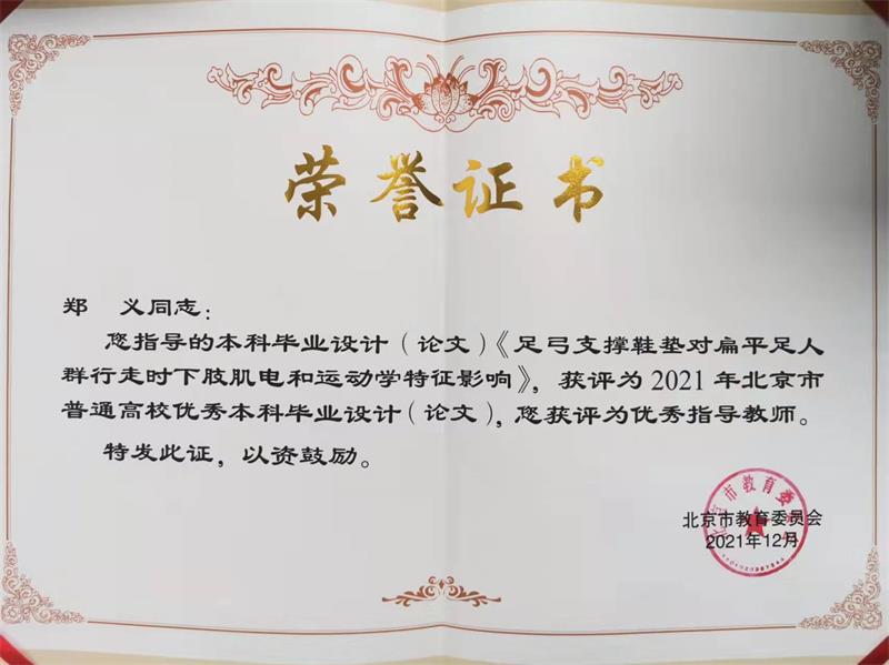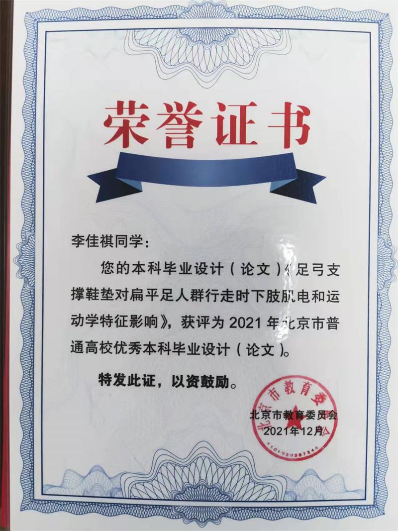 经过北京市教委评审,最终香蕉视频 解剖生力教研室郑义老师指导的2021届运动人体科学专业本科生李佳祺的毕业论文《足弓支撑鞋垫对扁平足人群行走时下肢肌电和运动学特征影响》被评为“北京市普通高校优秀本科毕业论文”,郑义老师被评为“优秀指导教师”。