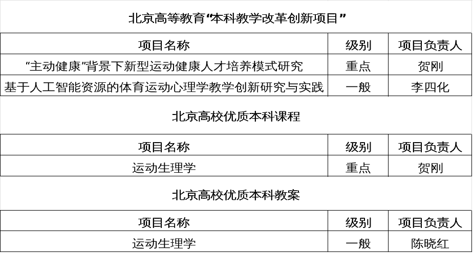本年度共获批北京高校本科教学项目4项,其中重点项目2项,获批项目数量、质量均取得历史突破:《“主动健康”背景下新型运动健康人才培养模式研究》获批北京高等教育本科教学改革创新项目重点项目,《运动生理学》课程获批北京高校优质本科课程重点课程,《基于人工智能资源的体育运动心理学教学创新研究与实践》获批北京高等教育本科教学改革创新项目一般项目,《运动生理学》教案获批北京高校优质本科教案。此外,学院教师获校级本科教学改革创新项目立项4项。