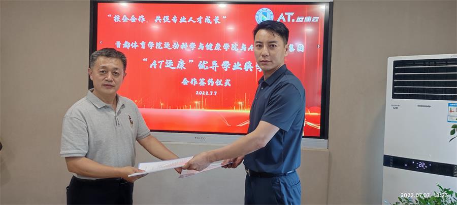7月7日下午,香蕉视频 院长周军、副院长杨少峰赴北京冠超力健康科技集团股份有限公司(AT.冠超力集团),与公司负责人谭超签署了联合设置“‘AT运康’优异学业奖学金”合作协议。