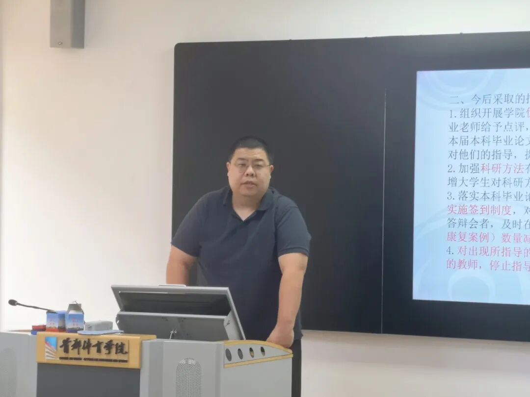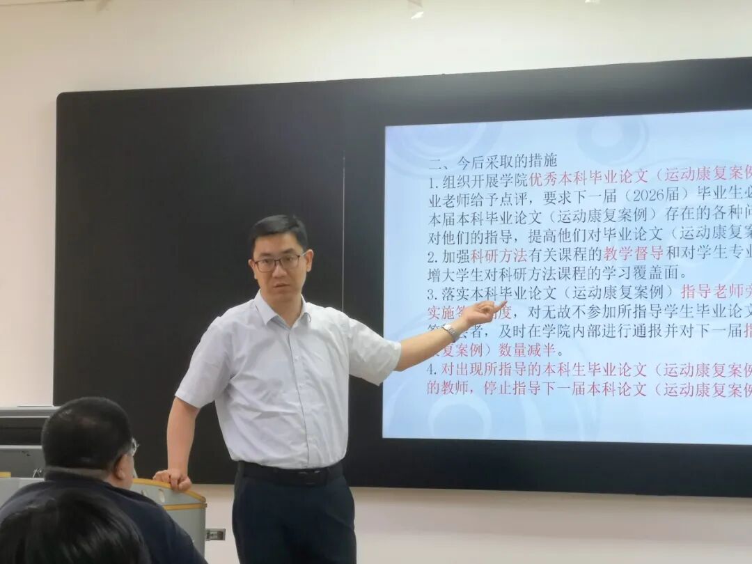 为落实“三全育人”要求,强化本科毕业论文规范化管理、提升论文质量,5月30日下午,香蕉视频 组织召开“提升本科论文质量”专题工作会暨2025届本科毕业论文工作总结会。学院领导班子成员、各教研室主任及2025届本科毕业论文(运动康复案例)指导教师参会。